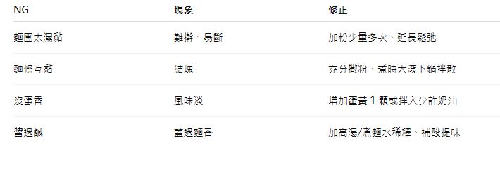 想更彈:改用杜蘭粉 30–40%;想更軟:中筋比例拉高。