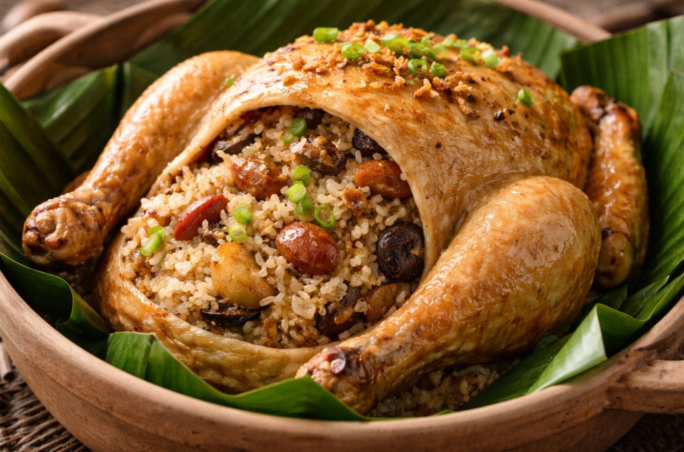 特色是把調味糯米塞進雞腹,經過長時間蒸煮後,雞汁慢慢滲入米飯,形成外嫩內香的雙重口感。